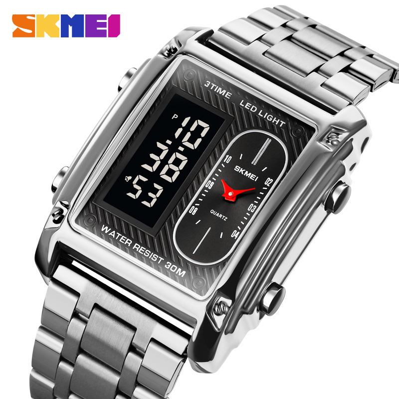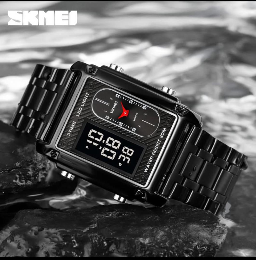 The Skmei Dual-Time Sportwatch is a military grade design watch with a high level of waterproofing that supports swimming and bathing. It has a digital and analog time display that enables you to set time for different countries at same time. The strap is made from top quality Stainless steel with scratch proof. It has a back LED light for night view. The Watch is Battery Powered.